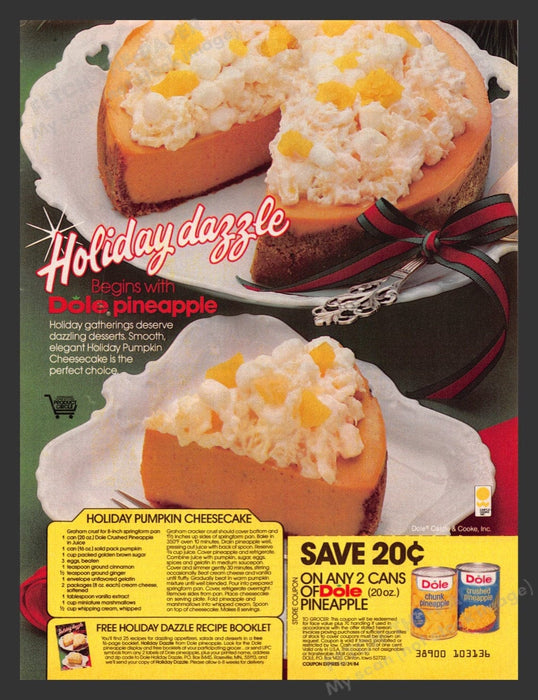 This 1983 Dole Pineapple print advertisement showcases a delightful "Holiday Pumpkin Cheesecake" recipe. The ad features a mouth-watering image of the cheesecake, topped with whipped cream and chunks of Dole pineapple, perfect for holiday gatherings. The vibrant colors and festive presentation capture the essence of the 1980s culinary trends.