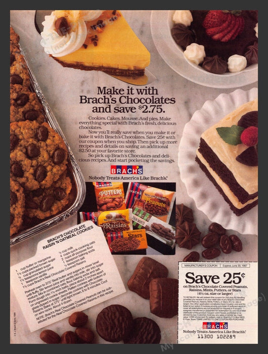 This 1986 print ad features a delightful recipe for "Brach's Chocolate Raisin 'n Oatmeal Cookies," showcasing the versatility and deliciousness of Brach's Chocolates. The ad includes a mouth-watering image of various desserts made with Brach's products, such as cookies, cakes, mousse, and pies, emphasizing how Brach's fresh chocolates can make any dessert special. The ad also highlights a coupon offer to save on Brach's Chocolate Covered Peanuts, Raisins, Mints, Putters, or Stars.