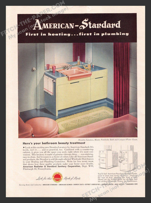 This vintage 1940s American-Standard advertisement showcases the elegant and practical Dresslyn Lavatory, Master Pembroke Bath, and Compact Water Closet. The ad highlights the stylish and functional design of the bathroom fixtures, emphasizing their convenience and aesthetic appeal. The image captures the essence of 1940s bathroom luxury with a pastel color palette and sleek lines.