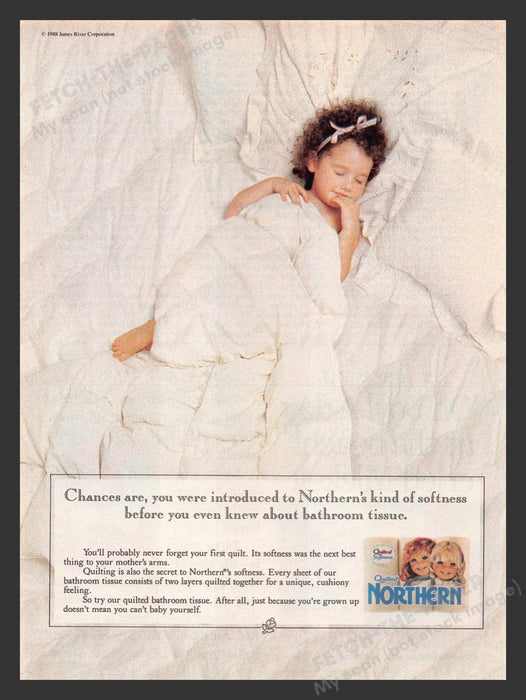 This 1989 Northern Quilted Bathroom Tissue advertisement features a serene image of a toddler peacefully sleeping on a white bed, highlighting the product's exceptional softness. The ad emphasizes the comforting and cushy feel of Northern's quilted bathroom tissue, likening it to the softness of a child's first quilt.