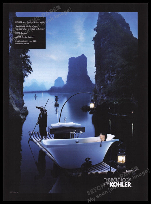This captivating Kohler bathtub print advertisement from the 2000s showcases a serene scene in Guilin, China. The ad features a luxurious Kohler bathtub set on a bamboo raft amidst the tranquil waters and stunning karst mountains of Guilin. A woman is seen relaxing in the bathtub, epitomizing relaxation and elegance. This original advertisement measures approximately 8" x 11" and was removed from a 2011 publication.