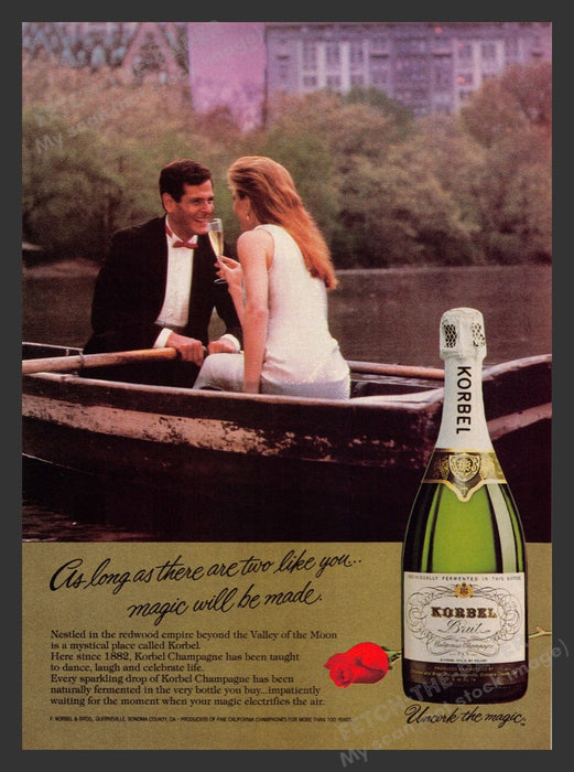 This 1983 Korbel Brut Champagne print advertisement exudes romantic elegance, capturing a couple in a rowboat, toasting with glasses of champagne. The serene backdrop and intimate setting highlight the timeless allure of Korbel Brut Champagne, inviting viewers to "Uncork the magic" and celebrate life's special moments with a touch of sophistication.