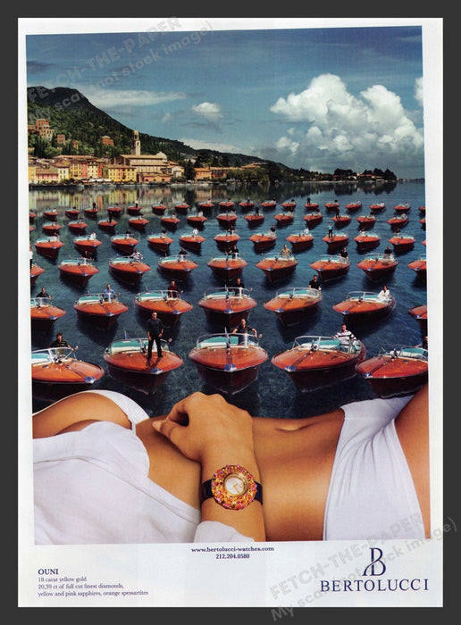 This stunning 2007 Bertolucci print advertisement showcases the luxurious Ouni watch set against a picturesque Italian backdrop. The ad features an array of Chris Craft boats elegantly lined up on serene waters, with the charming architecture of an Italian town in the distance. In the foreground, a close-up of a wrist adorned with the exquisite Ouni watch highlights its opulent design and craftsmanship.
