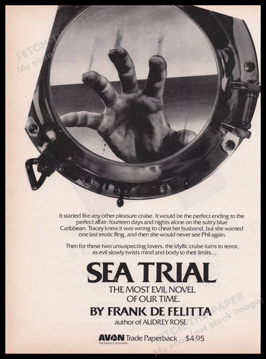 This vintage 1980s advertisement promotes Frank De Felitta's gripping novel, "Sea Trial." The ad features a haunting image of a hand pressed against a porthole, evoking a sense of suspense and terror that is central to the book's theme. The text teases the plot, describing a seemingly idyllic Caribbean cruise that turns into a nightmare as evil twists the minds and bodies of its unsuspecting lovers.