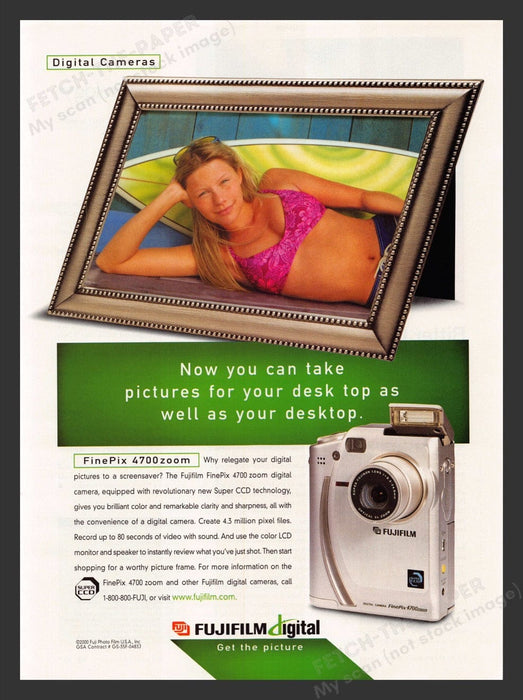 This 2000 magazine advertisement for the Fujifilm Digital Camera FinePix 4700 zoom showcases the sleek and innovative design of this early digital camera. The ad features a vibrant image of a woman in a pink bikini, emphasizing the camera's ability to capture vivid and lifelike photos. The tagline highlights the convenience of taking pictures for both your desk and desktop, reflecting the era's growing digital trend.