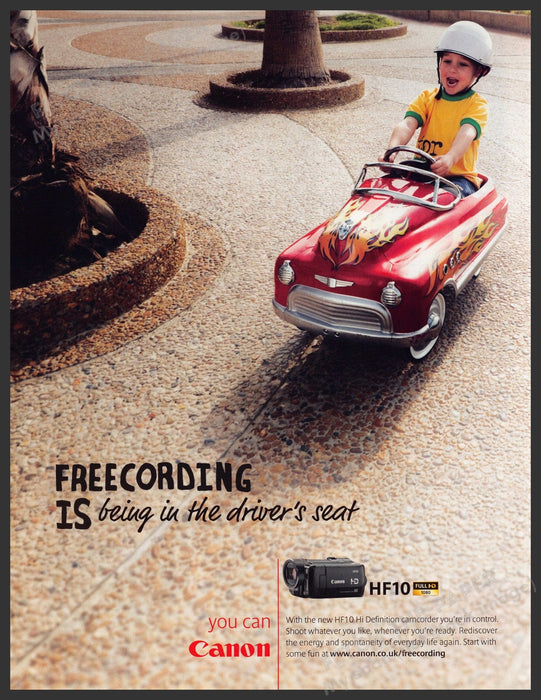This 2008 Canon HF10 camcorder advertisement captures the essence of childhood joy and freedom. The image features a toddler enthusiastically riding a vibrant red pedal car adorned with flame decals, evoking a sense of adventure and excitement. The tagline "Freecording IS being in the driver's seat" emphasizes the empowerment and creativity that comes with using the Canon HF10 camcorder.