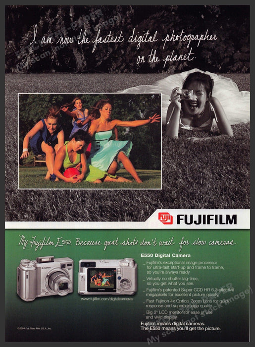 This original 2004 Fujifilm E550 Digital Camera print advertisement captures the spirit of fast-paced photography. The ad features an action-packed scene of girls playing football, emphasizing the camera's ability to capture dynamic moments with precision. The image showcases vibrant colors and sharp details, highlighting the camera's superior image quality.