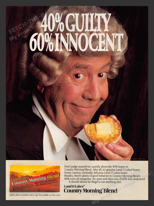This 1988 Land O Lakes "Country Morning Blend" print ad features a humorous depiction of a judge enjoying a buttered muffin, with the tagline "40% Guilty, 60% Innocent." The ad highlights the blend's composition of 60% corn oil margarine and 40% sweet cream butter, emphasizing its lower cholesterol content. This vintage advertisement captures the playful marketing style of the late 1980s.
