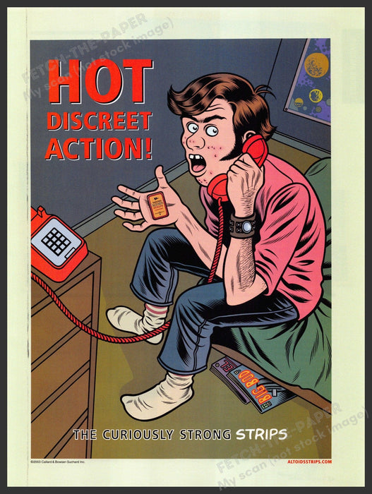 This vibrant 2000s print ad for Altoids showcases a quirky and humorous scene, featuring a young man in a retro setting. The bold headline "Hot Discreet Action!" grabs attention, while the illustration highlights the product's unique selling point - the curiously strong strips. The ad captures the essence of early 2000s pop culture with its distinctive style and playful imagery.