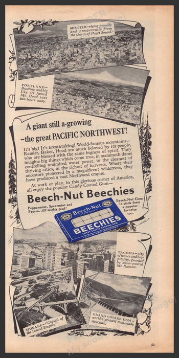 This vintage 1948 Beechies Beech-Nut Candy Coated Chewing Gum advertisement captures the essence of the growing Pacific Northwest. Featuring stunning images of Seattle, Portland, Spokane, Tacoma, and the Grand Coulee Dam, this ad highlights the region's natural beauty and industrial prowess. The text emphasizes the grandeur of the world-famous mountains and the pioneering spirit of the Northwest's people. A pack of Beech-Nut Beechies gum is prominently displayed, promoting its popularity among those who work and play in this magnificent corner of America.
