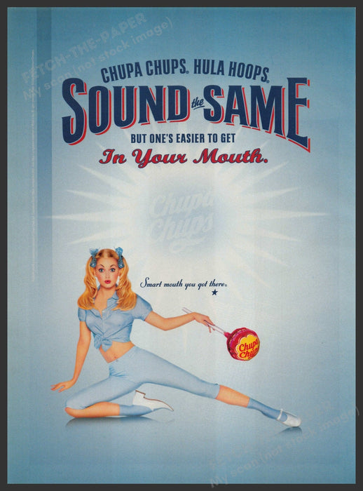 This 2001 Chupa Chups print advertisement captures the playful and nostalgic essence of the early 2000s. Featuring a retro-inspired design, the ad showcases a young woman in a blue outfit striking a dynamic pose, holding a Chupa Chups lollipop. The tagline humorously compares Chupa Chups to hula hoops, emphasizing that one is easier to get in your mouth.