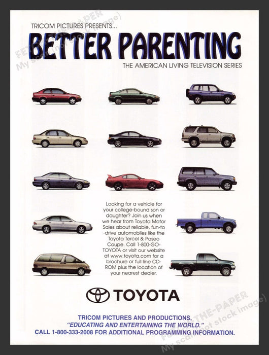 This 1997 Toyota print advertisement showcases a variety of Toyota vehicles from the 1990s, highlighting their reliability and appeal for families. The ad features multiple car models, including sedans, SUVs, and trucks, emphasizing the brand's versatility and commitment to quality. It also promotes the "Better Parenting" series by Tricom Pictures, linking the practicality of Toyota cars with family-oriented values.