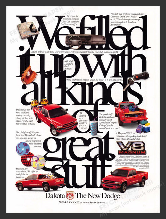 This original 1999 print advertisement for the Dodge Dakota V8 Magnum showcases the versatility and features of this robust truck from the 1990s. The ad highlights the spaciousness, safety features, and powerful engine options available in the Dakota, making it a standout choice for truck enthusiasts of that era.