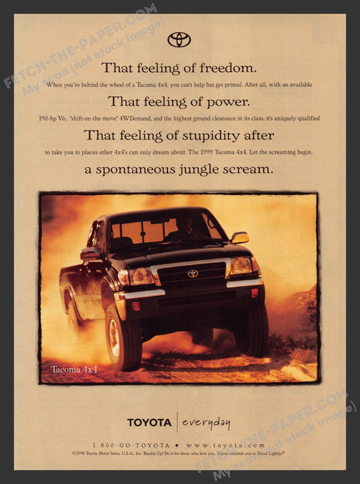 This original 1999 print advertisement for the Toyota Tacoma 4x4 truck captures the essence of adventure and power from the late 1990s. The ad showcases the rugged Tacoma 4x4 navigating through a dusty terrain, highlighting its robust capabilities and off-road prowess.