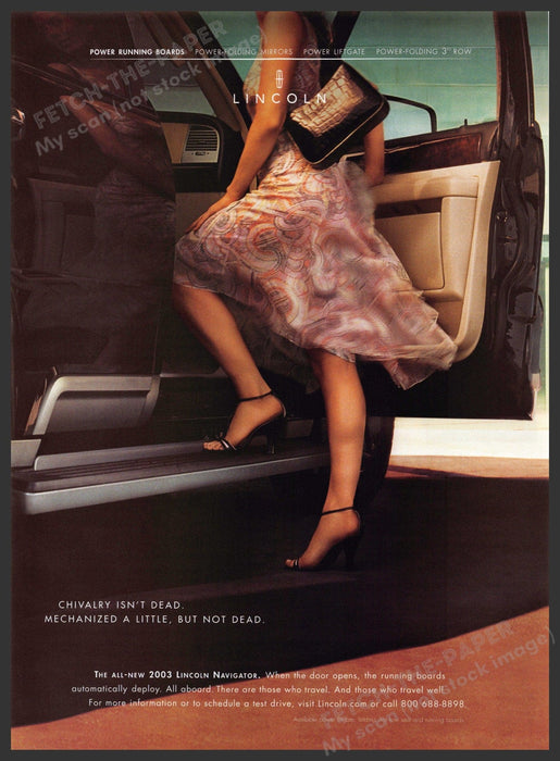 This original 2000s print ad showcases the elegance and sophistication of the Lincoln Navigator. The advertisement features a stylish woman stepping into the luxurious vehicle, highlighting the modern amenities such as power running boards, power-folding mirrors, and a power liftgate. The flowing dress and high heels emphasize a sense of grace and class, making it an appealing piece for collectors.