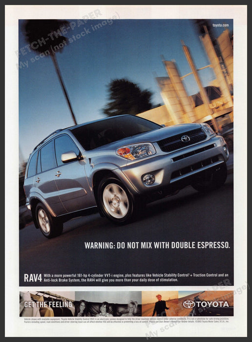 This is a captivating print advertisement from the 2000s, showcasing the 2004 Toyota Rav4 SUV. The ad features a dynamic image of the Rav4 in motion, emphasizing its power and agility with a backdrop that hints at speed and adventure. The tagline "Warning: Do not mix with double espresso" humorously suggests the vehicle's exhilarating performance.