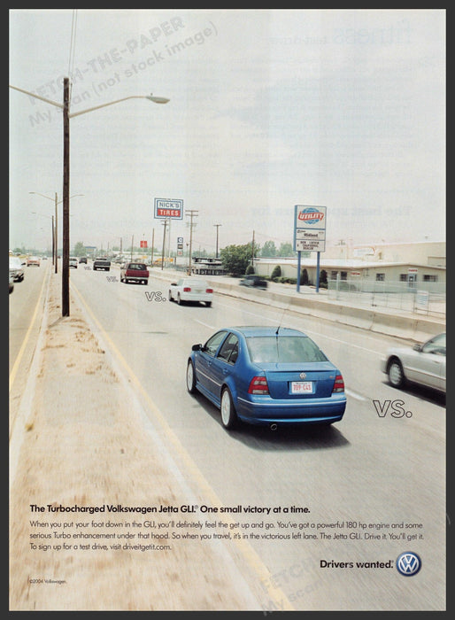 This 2004 print advertisement showcases the turbocharged Volkswagen Jetta GLI, highlighting its performance and power on the road. The image features the Jetta GLI confidently leading other cars, emphasizing its superior speed and agility. The ad conveys a sense of victory and dominance, appealing to drivers who seek both style and performance in their vehicle.