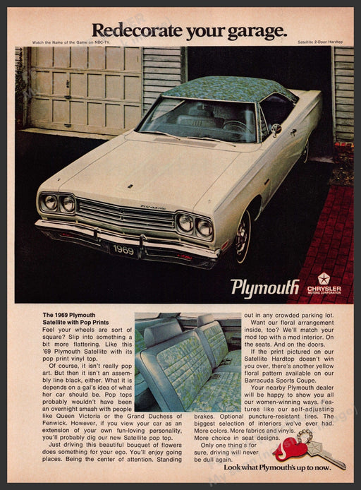 This vintage magazine advertisement from the 1960s showcases the 1969 Chrysler Plymouth Satellite with Pop Prints. The ad features a stylish white ...