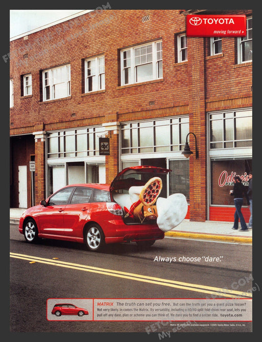 This 2005 print ad for the Toyota Matrix humorously showcases the car's impressive cargo space by featuring a man in a pizza costume emerging from ...