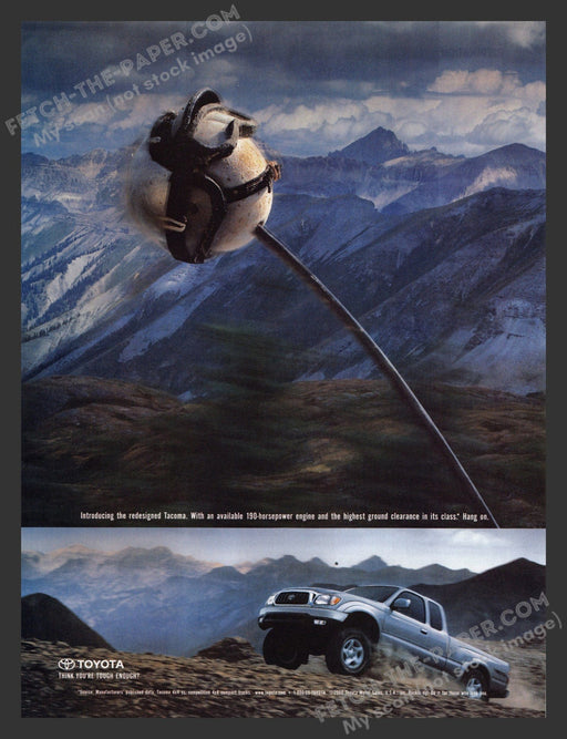 This 2001 magazine ad for the Toyota Tacoma 4x4 Truck showcases the rugged and adventurous spirit of the vehicle. Set against a dramatic mountainou...