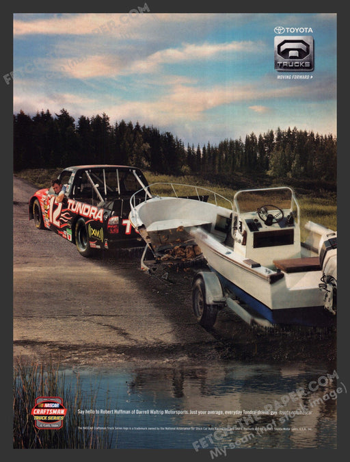 This vintage print ad from the 2000s showcases Toyota Trucks, featuring NASCAR driver Robert Huffman of Darrell Waltrip Motorsports. The scene depi...