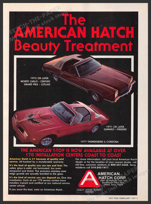 American Hatch 1970s Magazine Print Advertisement 1977 T-Top Camaro Monte Carlo