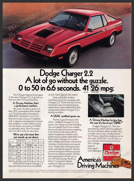 Step back into the dynamic 1980s with this original 1982 magazine print advertisement for the Dodge Charger 2.2. This vibrant ad showcases the slee...
