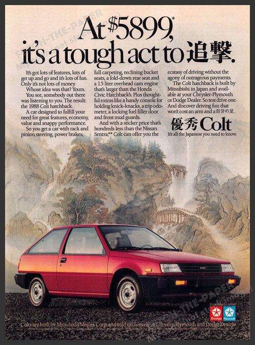 This 1987 Dodge Colt print advertisement showcases the vibrant and economical hatchback against a backdrop of traditional Japanese art, emphasizing...