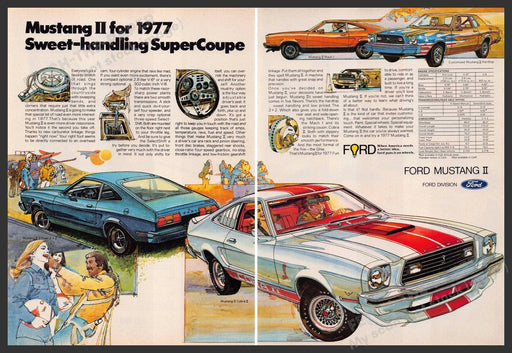 This vintage 1977 magazine advertisement for the Ford Mustang II showcases the sweet-handling SuperCoupe. The ad features vibrant illustrations of ...