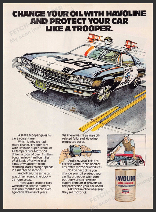 This vintage 1977 Havoline magazine advertisement showcases a state police car, emphasizing the reliability and protection provided by Havoline Sup...