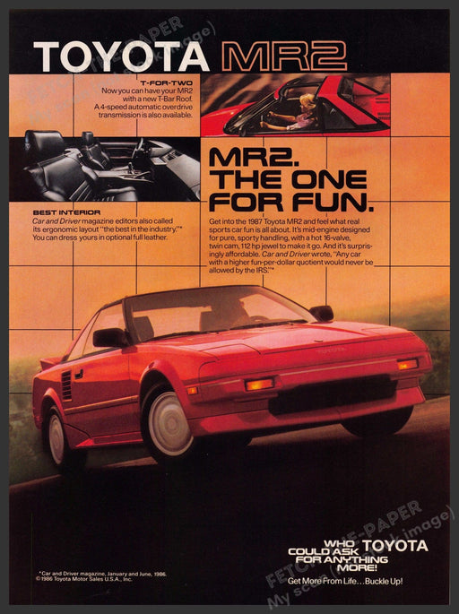 Step back into the 1980s with this original 1987 magazine advertisement for the Toyota MR2. This vibrant print ad captures the essence of fun and s...