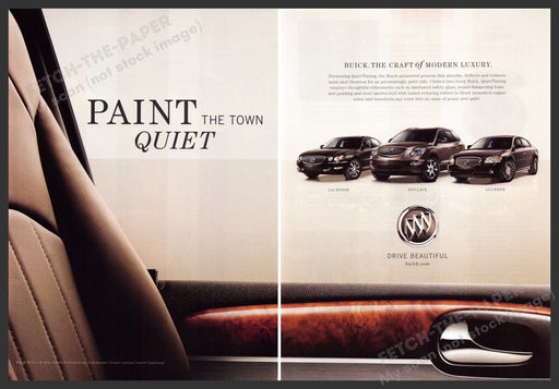 This is a 2000s Buick print advertisement from 2008, showcasing the Lacrosse, Enclave, and Lucerne models. The ad emphasizes Buick's QuietTuning te...
