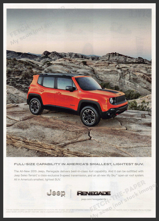 This is a 2015 print advertisement for the Jeep Renegade, showcasing its robust capabilities in a rugged, rocky terrain. The ad highlights the vehi...