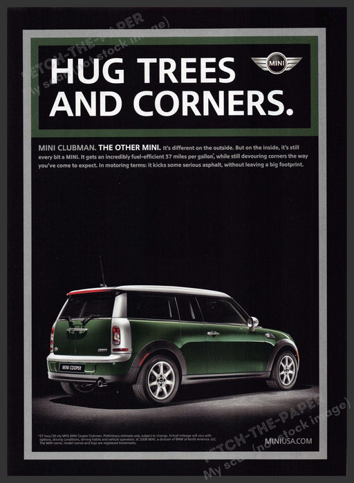 This original 2008 Mini Cooper print advertisement showcases the sleek and stylish Mini Clubman. The ad emphasizes the car's unique ability to "Hug...