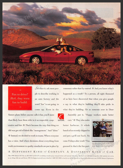 This 1995 Saturn SC1 advertisement captures the essence of driving fun and team spirit. Set against a picturesque landscape, it features a group of...