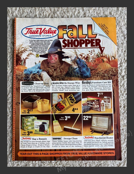 This 1980s True Value Fall Shopper Catalog Booklet Magazine Insert from 1980 is a nostalgic trip back to the era of big hair and classic home goods. This 4-page insert measures approximately 8" x 11" and features a variety of products that were popular during the fall season of the 1980s. The cover showcases a scarecrow amidst a backdrop of pumpkins, setting the autumnal theme for the catalog.
