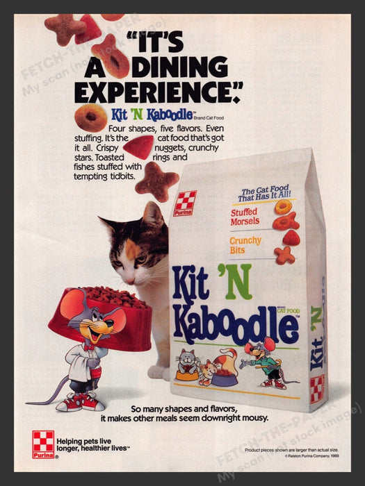 This 1989 print ad for Purina Kit 'N Kaboodle Cat Food showcases a delightful dining experience for your feline friend. The advertisement features a playful calico cat eagerly eyeing a bowl of the colorful, varied shapes and flavors of Kit 'N Kaboodle. A cheerful cartoon mouse character is also present, adding a whimsical touch to the ad. The vibrant imagery and catchy slogan highlight the fun and flavorful appeal of this cat food.