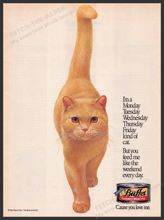 This vintage 1986 magazine print advertisement features a charming illustration of an orange cat, walking confidently towards the viewer. The ad highlights Buffet Gourmet Varieties cat food, with a playful message that reads: "I'm a Monday Tuesday Wednesday Thursday Friday kind of cat. But you feed me like the weekend every day. 'Cause you love me." The artwork captures the essence of the 1980s with its nostalgic and heartwarming appeal.