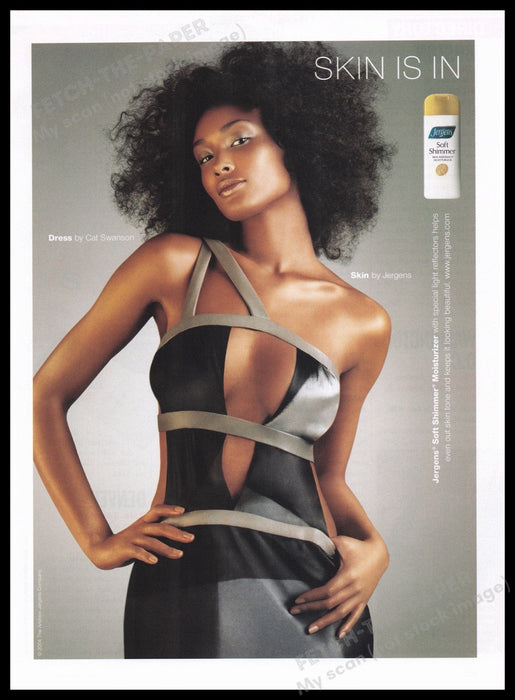 This 2004 Jergens advertisement showcases the elegance and allure of the 2000s fashion era. The ad features a stunning model in a striking dress designed by Cat Swanson, emphasizing smooth, radiant skin highlighted by Jergens Soft Shimmer Moisturizer. The tagline "Skin is In" captures the essence of beauty and skincare trends of the time.