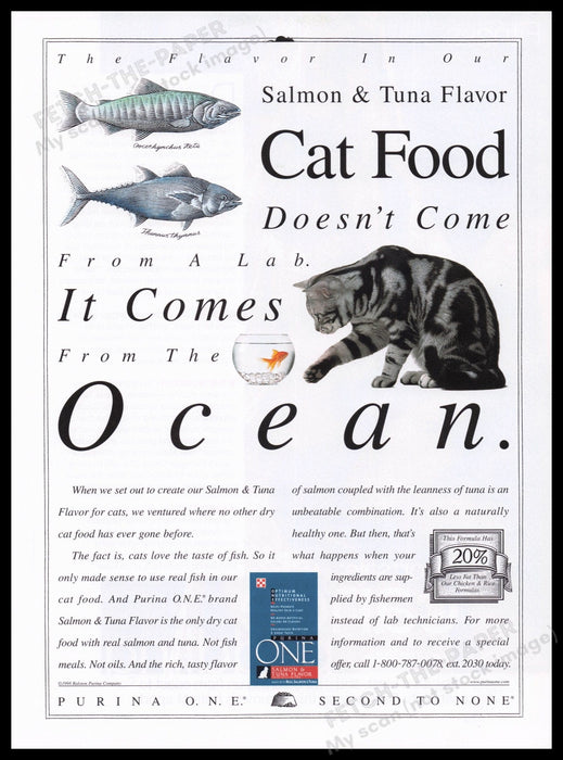 This vintage 1999 Purina Cat Food advertisement highlights the brand's commitment to using real fish in their Salmon & Tuna flavor cat food. The ad features a curious gray kitty intently watching a goldfish in a bowl, emphasizing the natural appeal of ocean-sourced ingredients over lab-created alternatives. The detailed illustration of salmon and tuna further underscores the authenticity and quality of Purina's product.