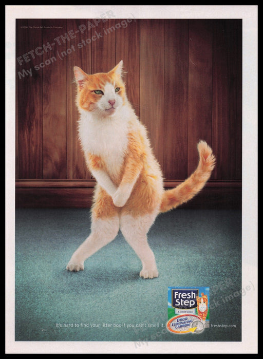 This 2006 print advertisement for Fresh Step Kitty Litter features a humorous image of a cat standing on its hind legs, seemingly in need of findin...