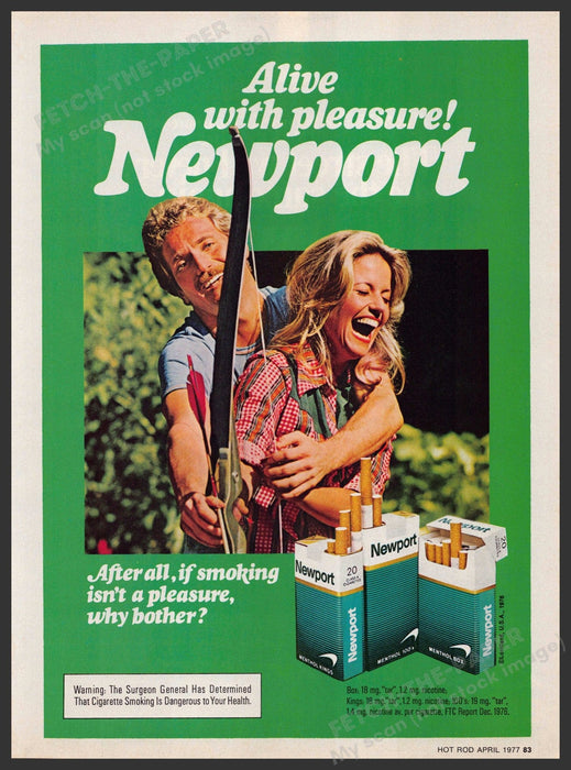 This vintage Newport magazine print advertisement from 1977 features a cheerful couple enjoying an archery session. The vibrant image captures the essence of the 1970s with its lively and carefree spirit, emphasizing the slogan "Alive with pleasure!" The ad showcases Newport cigarettes prominently in the foreground, reinforcing the message that smoking should be a pleasurable experience.