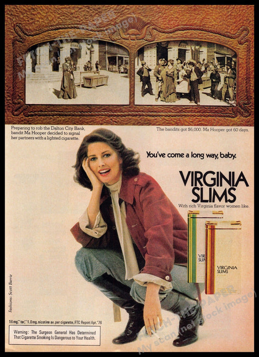 This vintage 1977 Virginia Slims magazine advertisement captures the essence of the 1970s with its nostalgic imagery and classic tagline, "You've come a long way, baby." The ad features a playful scene of bandits preparing to rob the Dalton City Bank, with Ma Hooper signaling her partners with a lit cigarette. Below, a stylish woman epitomizes the era's fashion, showcasing a confident and liberated attitude.