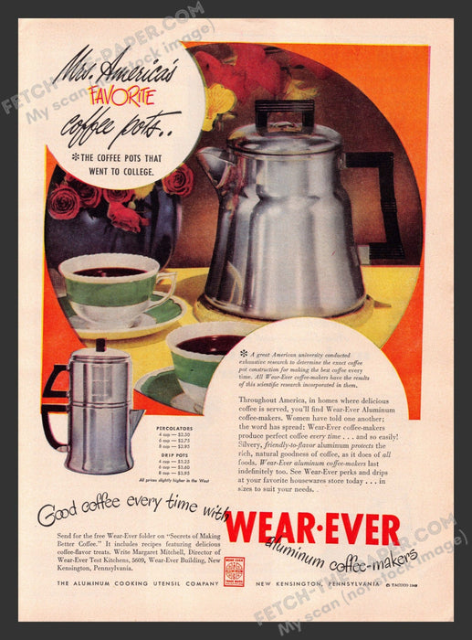This 1940s advertisement showcases the popular Wear-Ever coffee pots, which were a staple in American households. The ad highlights the sleek aluminum design of the coffee pots, emphasizing their durability and ability to produce perfect coffee every time. The vibrant colors and classic design elements reflect the era's aesthetic, making this a charming piece of vintage advertising.