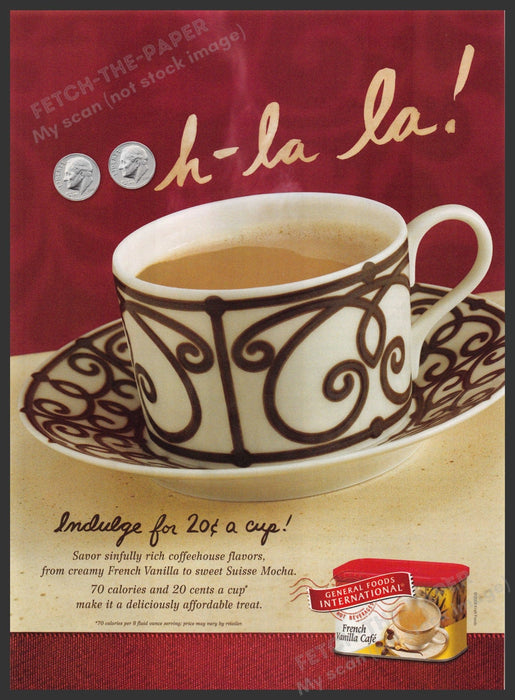 Step back into the 2000s with this delightful French Vanilla Cafe magazine print ad from 2009. The advertisement showcases a steaming cup of coffee in an elegant, intricately designed cup and saucer, set against a rich red background with the playful phrase "Ooh-la-la!" prominently displayed. This ad invites you to indulge in the sinfully rich flavors of French Vanilla Cafe for just 20 cents a cup, making it a deliciously affordable treat.