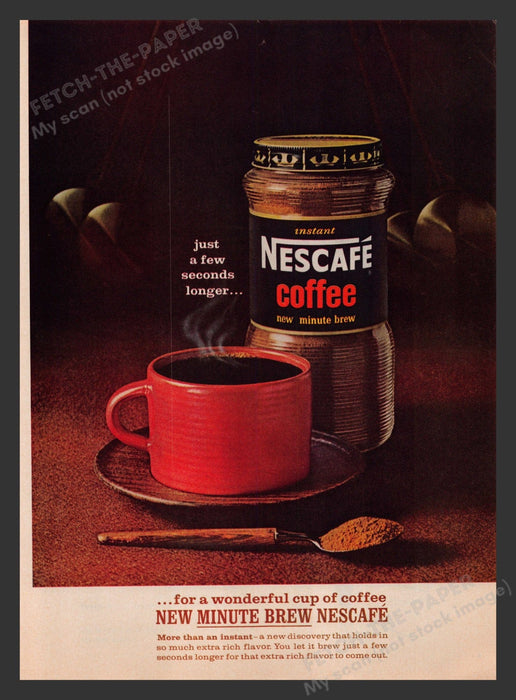 Step back into the 1960s with this original Nescafe print advertisement from 1964. The ad showcases a jar of Nescafe's new minute brew coffee alongside a steaming red mug, highlighting the rich flavor that comes with just a few extra seconds of brewing. This vintage piece captures the essence of mid-century coffee culture and the innovative spirit of the era.