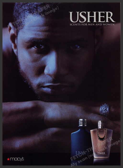 This 2007 print advertisement features a captivating close-up of Usher, showcasing his intense gaze and strong, defined arms. The ad promotes "Usher" fragrances for men and women, highlighting the sleek and elegant bottle designs. The dark, moody lighting emphasizes the sophistication and allure of the scents. This listing is for the magazine print ad only, not the fragrance itself.