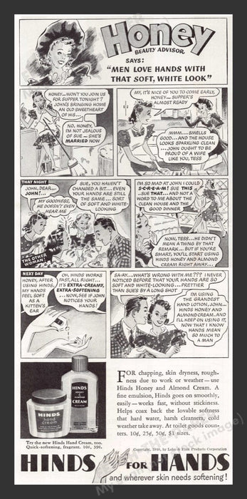Hinds Hand Cream 1940s Print Advertisement Ad 1940 Honey Comic Cartoon