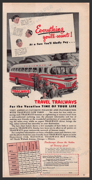 This 1949 National Trailways Bus System advertisement captures the essence of mid-20th century travel. Showcasing a vibrant red Trailways bus, the ad highlights the convenience and affordability of bus travel during the 1940s. The image features happy passengers enjoying their journey, emphasizing the comfort and scenic views available on Trailways buses. The ad also includes fare information to various destinations, promoting the economical aspect of traveling with Trailways.