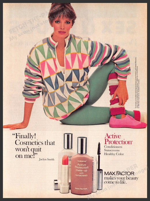 This vibrant 1984 Max Factor magazine advertisement features Jaclyn Smith showcasing the brand's Active Protection line of cosmetics. Dressed in colorful geometric patterns and green tights, Jaclyn epitomizes the bold and energetic style of the 1980s. The ad highlights the durability and effectiveness of Max Factor's products, promising cosmetics that won't quit on you.